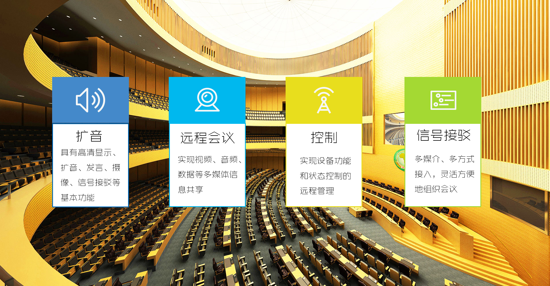智能化會議系統具有高清顯示、擴音、發(fā)言、攝像、信號接駁等基本功能,同時也應具備智能化管理功能;實現視頻、音頻、數據等多媒體信息共享;實現設備控制和狀態(tài)的安全遠程管理;具有會議預訂、變更、查詢、錄播、權限設置等會議管理功能;具有應急響應功能;可實現在會議中的無縫切換,保障會議平穩(wěn)進行;多媒介,多方式接入,靈活方便地組織會議。